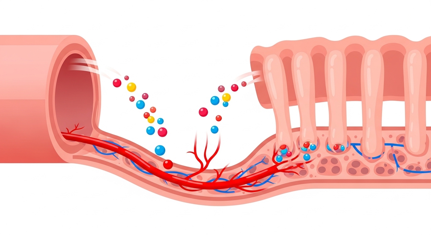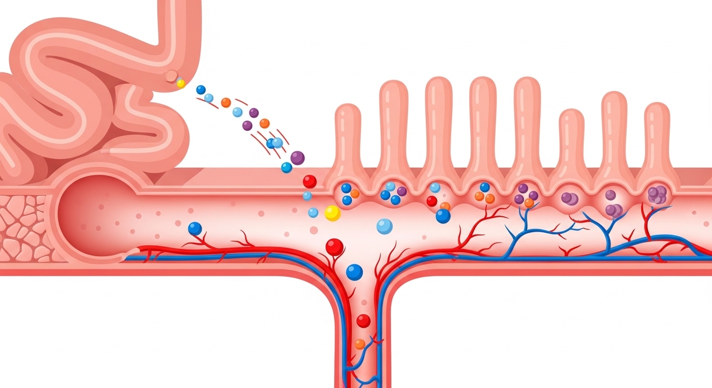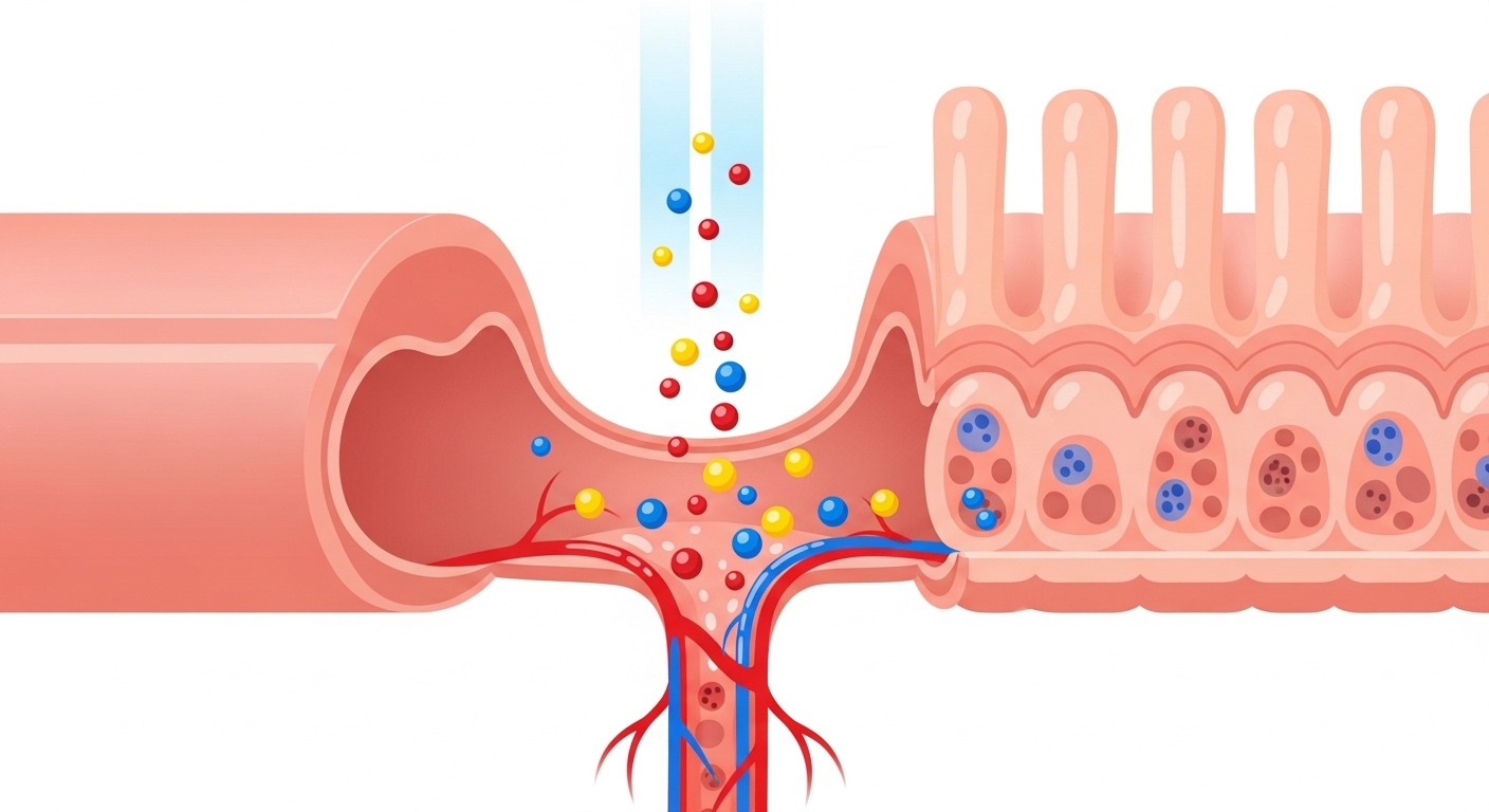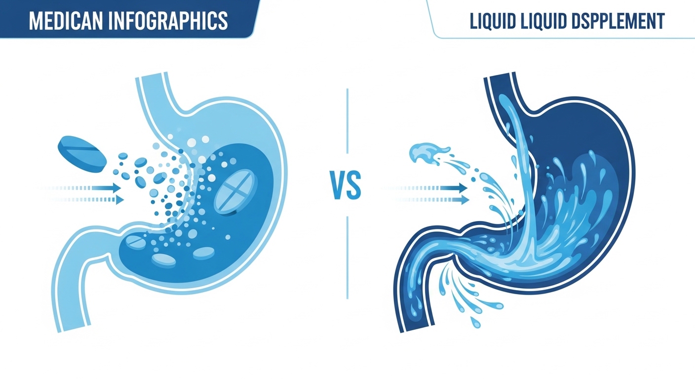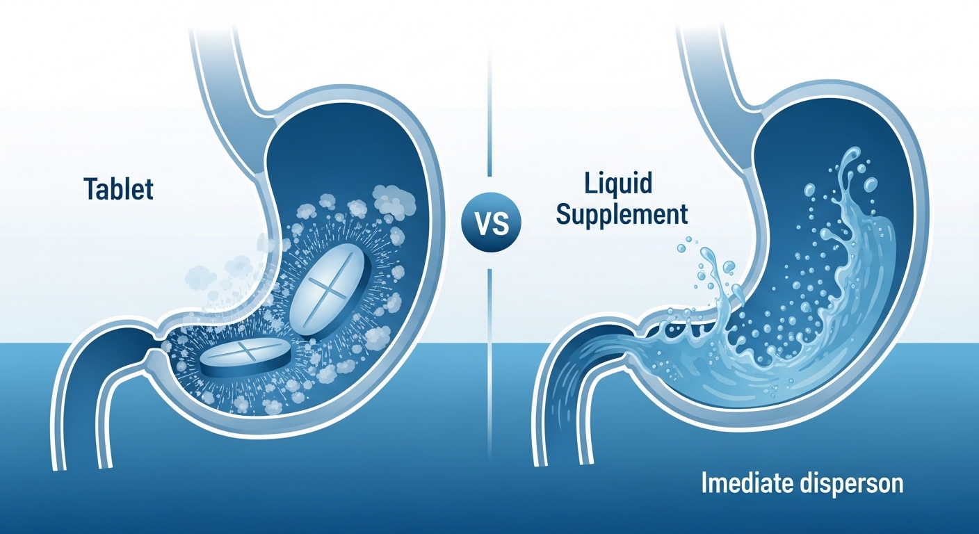 우리가 섭취하는 영양제는 소화 과정을 거치며 분해됩니다. 정제(알약)는 위장에서 붕해되는 시간이 필요하지만, 액상은 이미 분해된 상태로 장에 도달하기 때문에 흡수 속도가 월등히 빠릅니다.
