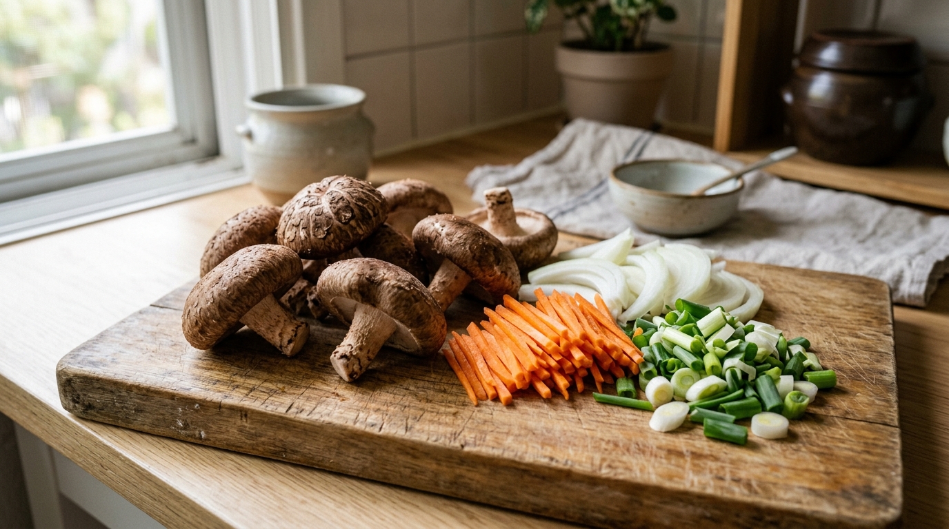- 주재료: 생표고버섯 8~10개, 양파 1/2개, 당근 약간(색감용), 쪽파 혹은 대파