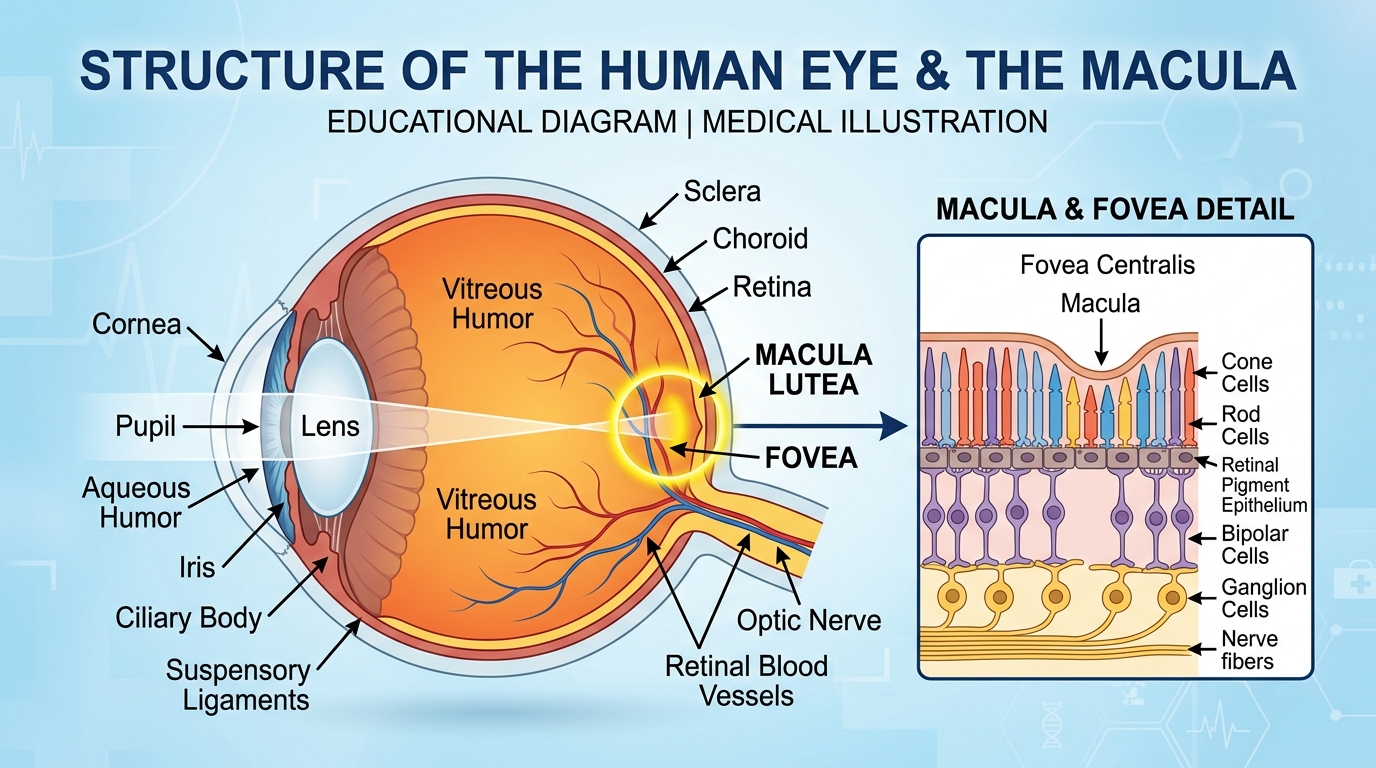 루테인은 눈의 망막 중앙에 위치한 **황반**의 구성 성분인 카로티노이드 색소입니다. 황반은 시력의 90% 이상을 담당하는 매우 중요한 부위입니다. 루테인은 강한 자외선과 스마트폰에서 나오는 블루라이트를 흡수하여 망막 세포의 손상을 막아주는 역할을 합니다.