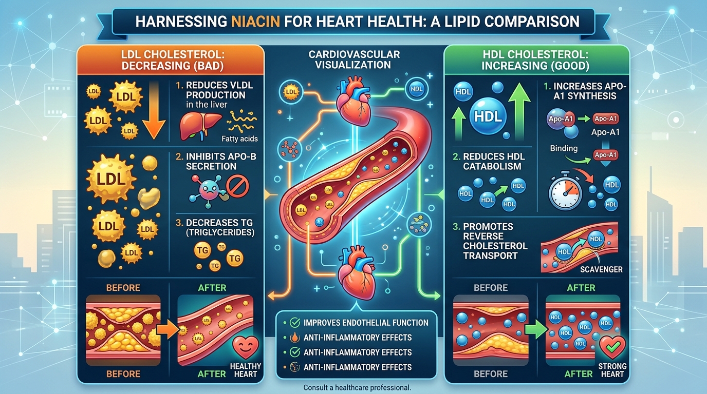 과거부터 나이아신은 고용량 처방을 통해 LDL 콜레스테롤과 중성지방을 낮추고 HDL 콜레스테롤을 높이는 용도로 사용되어 왔습니다. 하지만 현대 의학에서는 이를 단독 처방하기보다는 생활 습관과 병행하는 보조 요법으로 권장합니다.