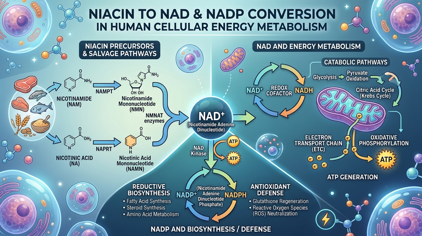우리 몸의 세포는 음식을 에너지(ATP)로 전환할 때 나이아신을 필요로 합니다. 2023년 발간된 영양학 학술지 자료에 따르면, 나이아신 결핍은 세포 단위의 에너지 생산 저하를 초래하며 만성 피로의 원인이 될 수 있습니다.