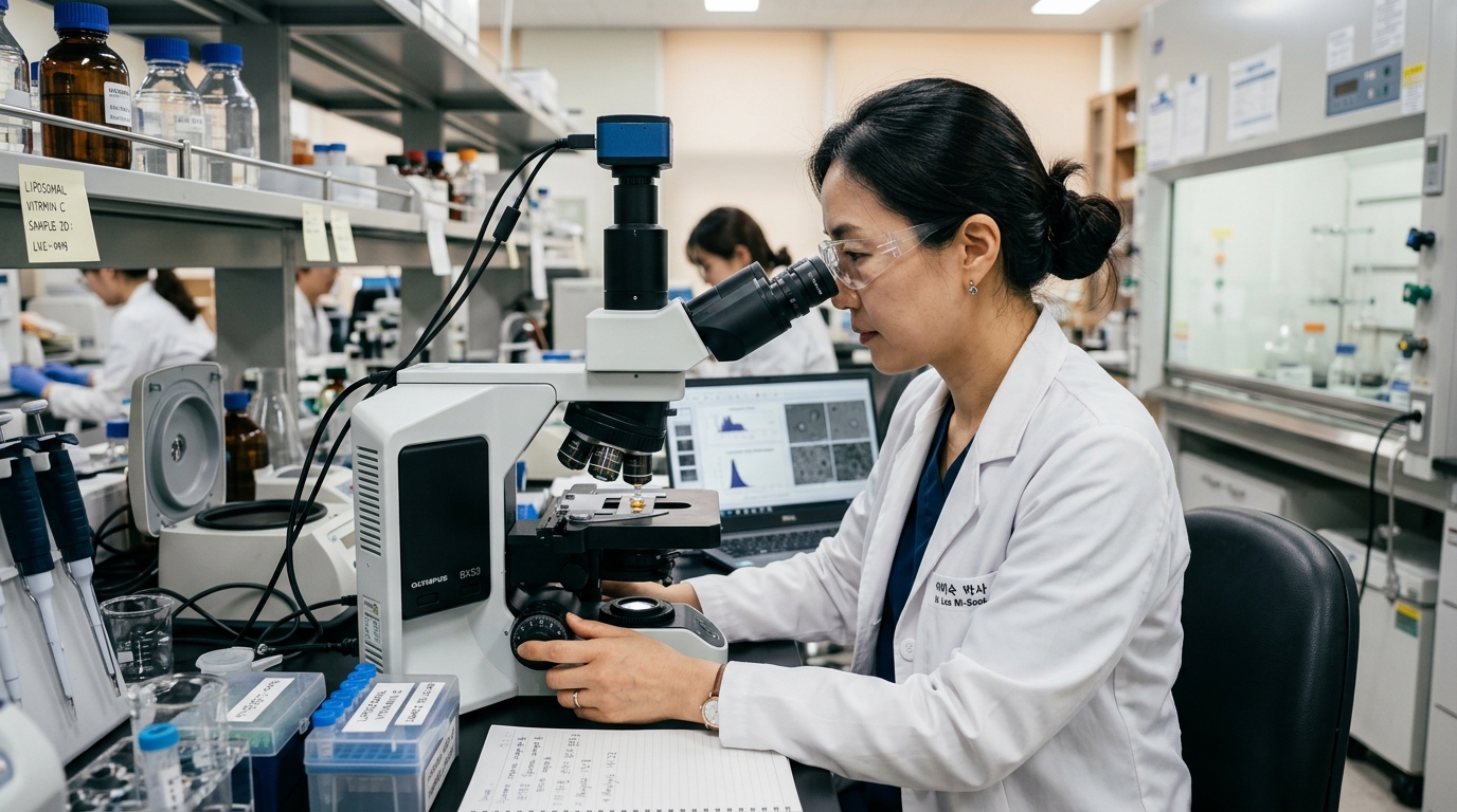 리포좀(Liposome)은 지방 성분인 인지질로 이루어진 미세한 구체입니다. 이 내부에 비타민 C를 가두어 우리 몸의 세포막을 쉽게 통과하도록 돕는 전달체 역할을 합니다.