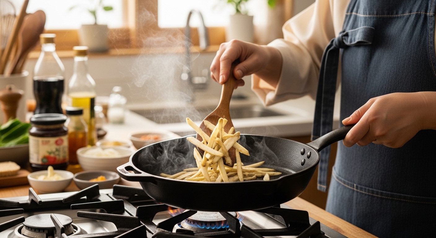 - 우엉 볶기 (1차): 물기 제거된 우엉을 넣고 중불에서 2~3분 볶아줍니다. 이 과정은 우엉의 날냄새를 날리고, 표면을 약간 코팅해 양념이 고르게 붙도록 돕습니다. 색이 살짝 투명해지면 완료입니다.