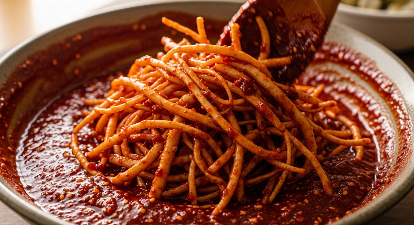 - 기본 무침 비율: 고추장 : 고춧가루 : 간장 : 매실청 = 3 : 2 : 1 : 2.