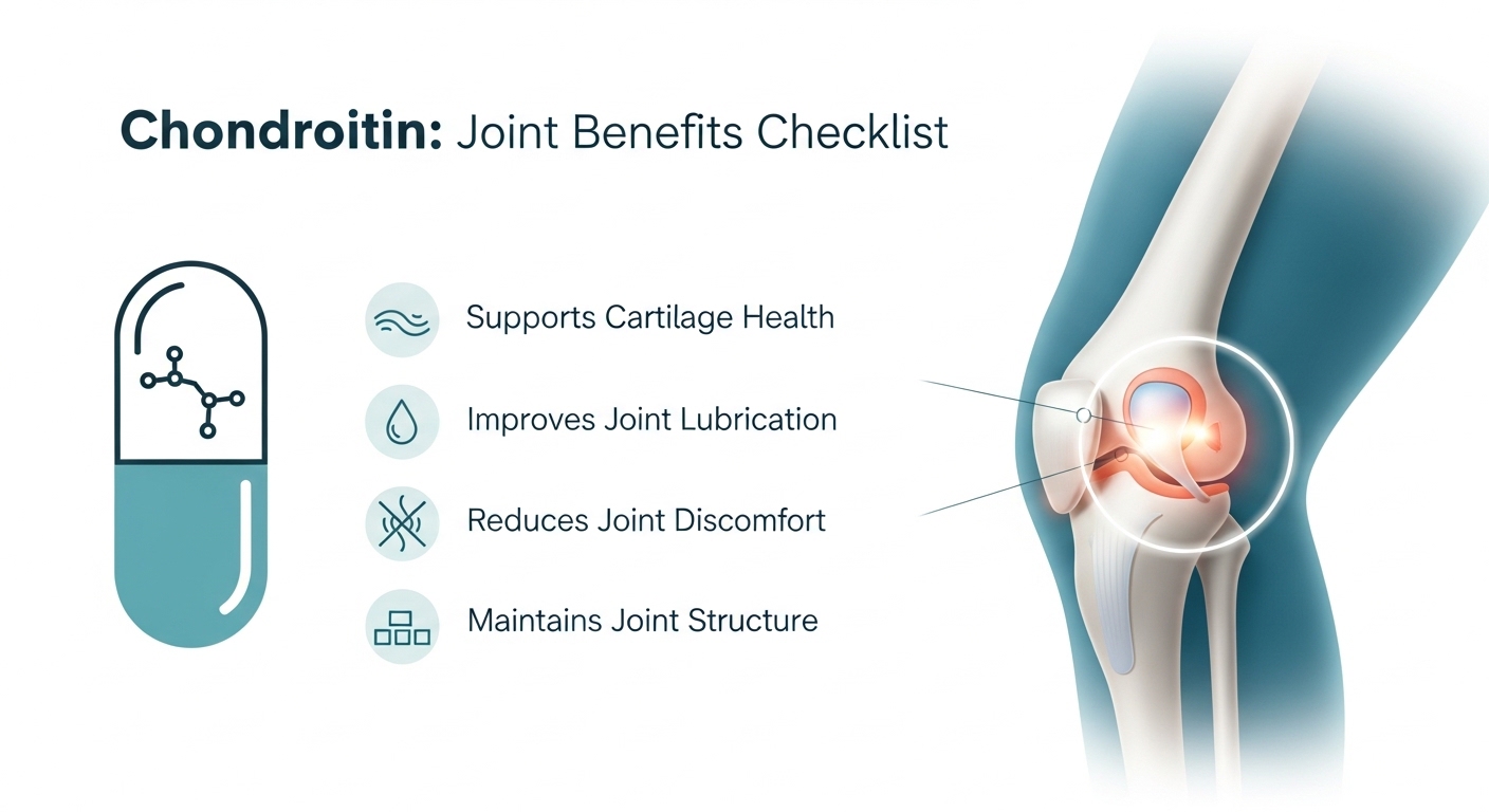 - 글루코사민과 병용 시 시너지 — 콘드로이친(분해 차단) + 글루코사민(재료 공급).
