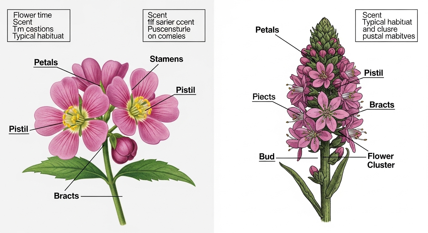 | 꽃자루 길이 | 짧음 — 가지에 촘촘히 붙어있음 | 김 — 꽃자루가 눈에 띄게 긺 |