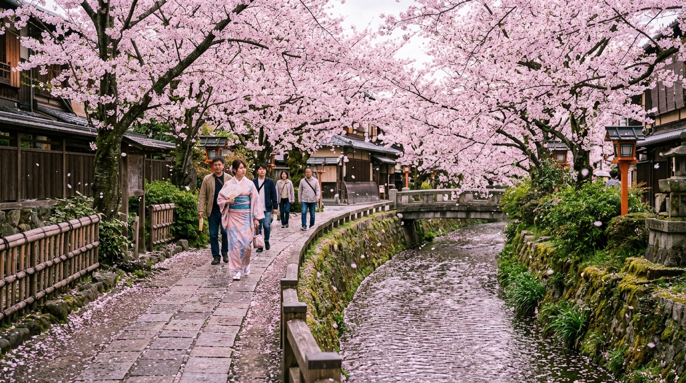 가장 많은 여행객이 선택하는 타이밍. 교토·오사카·나고야 동시 만개. 교토 철학의 길·아라시야마·기요미즈데라, 오사카성 공원 추천. 숙소는 최소 3~6개월 전 예약 필수.