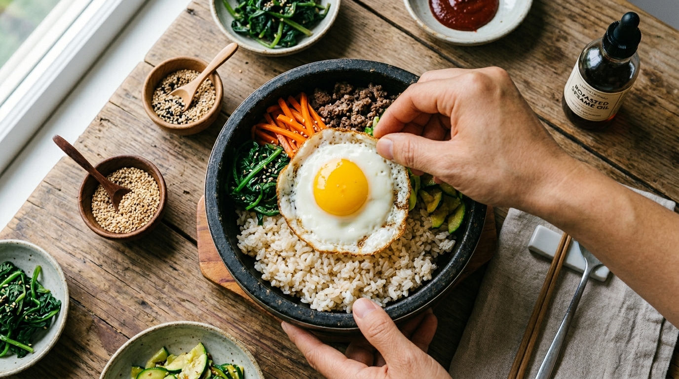 - 봄동비빔밥: 겉절이 + 반숙 계란프라이 + 참기름. 고추장 없이도 OK.