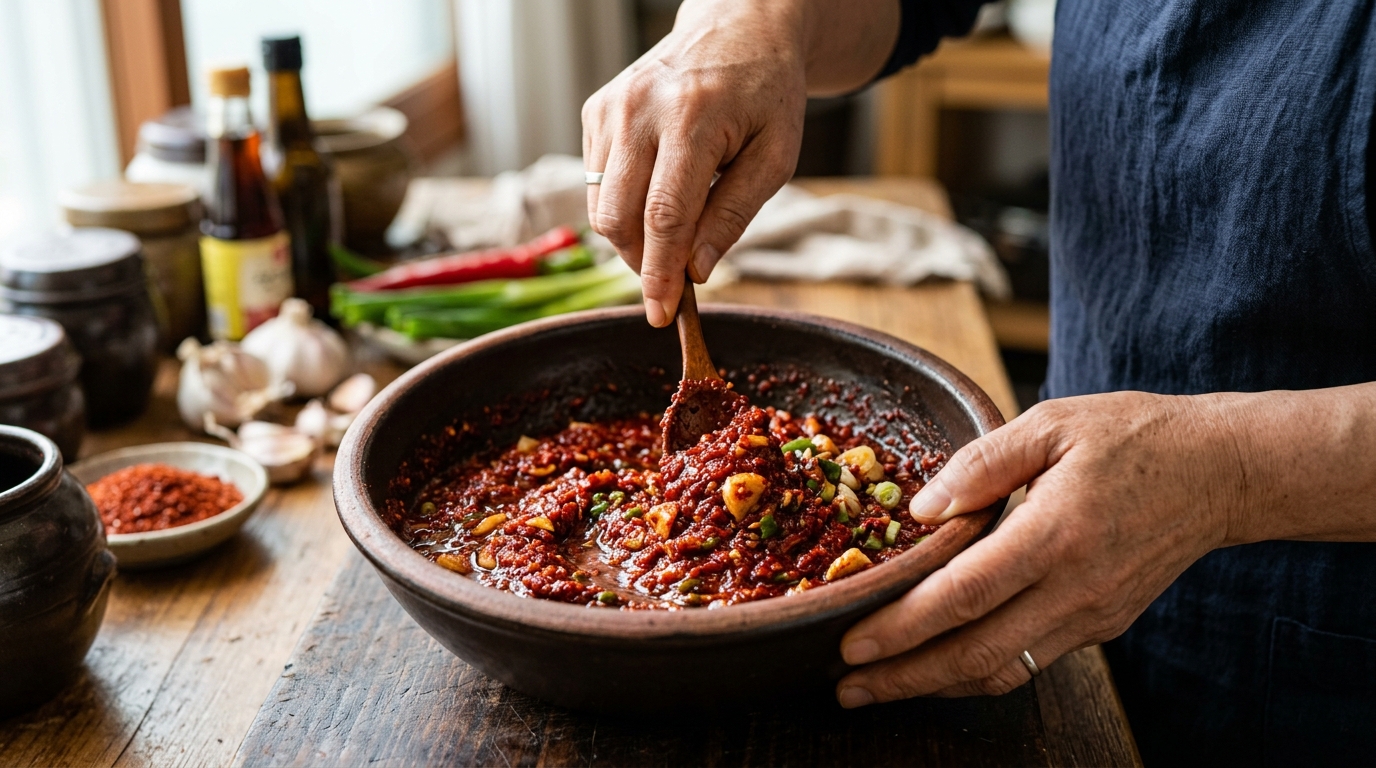 - 양념장 만들기 — 볼에 고춧가루를 제외한 양념(멸치액젓·다진 마늘·매실액·굵은소금)을 먼저 잘 섞어 준비합니다. 고춧가루는 버무릴 때 따로 넣으면 수분이 덜 나오고 색감이 더 좋아집니다.