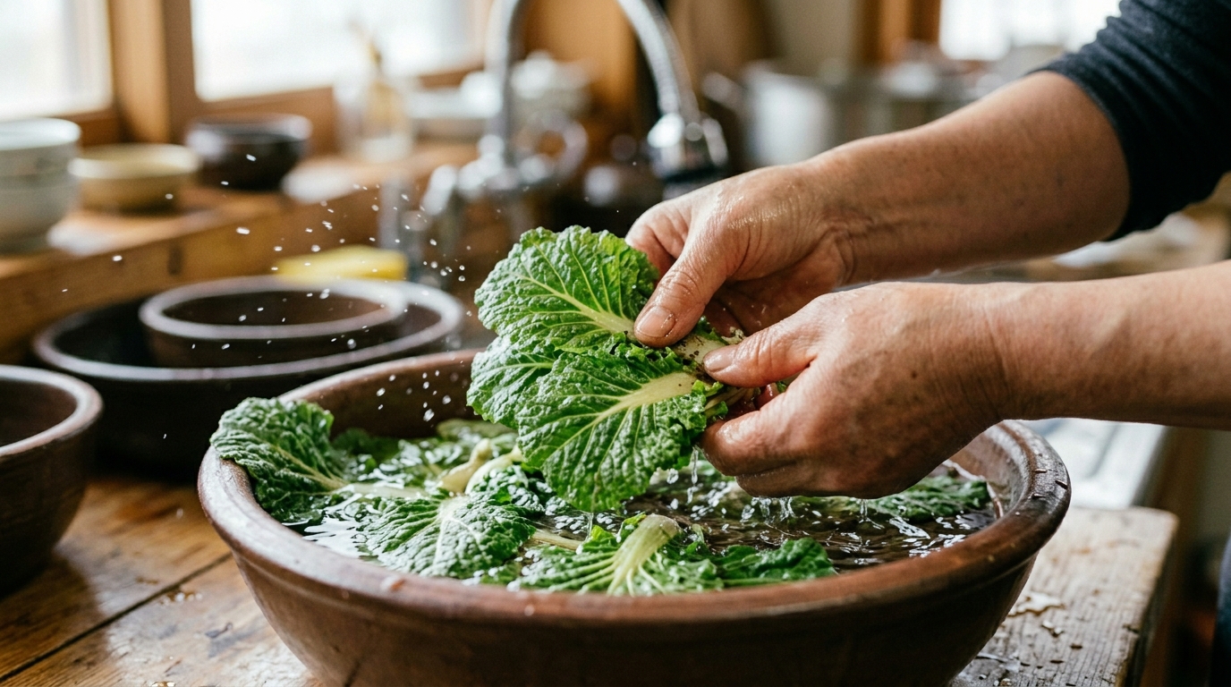 - 봄동 손질 — 밑동 심지 부분을 사각형으로 도려내면 잎이 분리됩니다. 잎을 하나씩 떼어 찬물에 10분간 담가 두세요. 줄기 부분 흙을 꼼꼼히 씻어내고 잎도 2~3회 흔들어 헹궈줍니다.