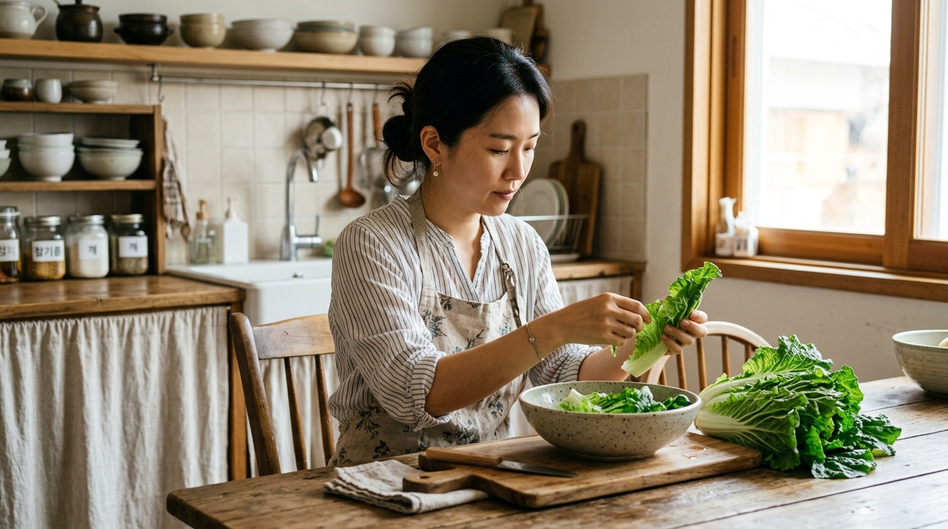 - 먹기 좋은 크기로 썰기 — 큰 잎은 세로로 반 자르거나 한 입 크기로 썰어줍니다. 손으로 찢어도 좋습니다.