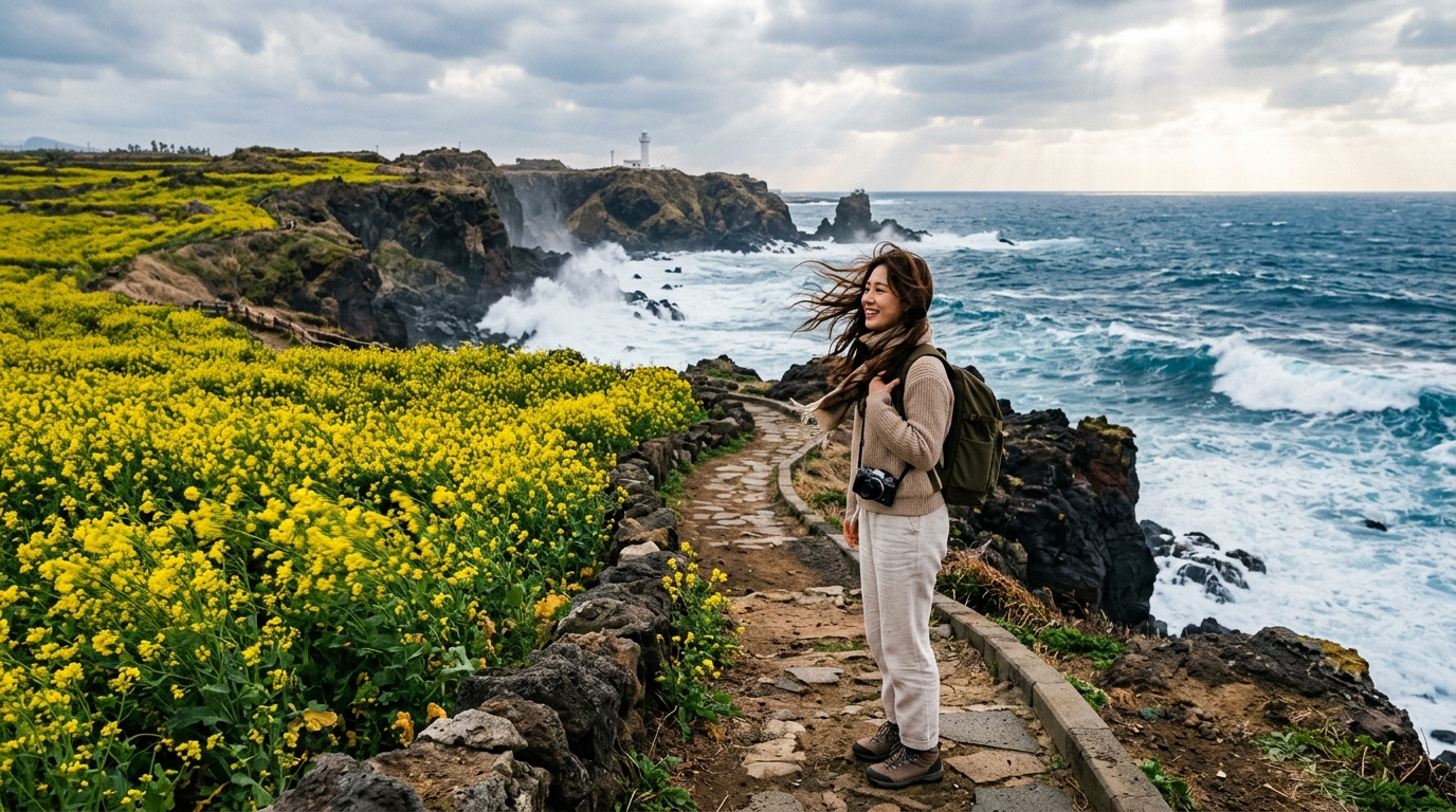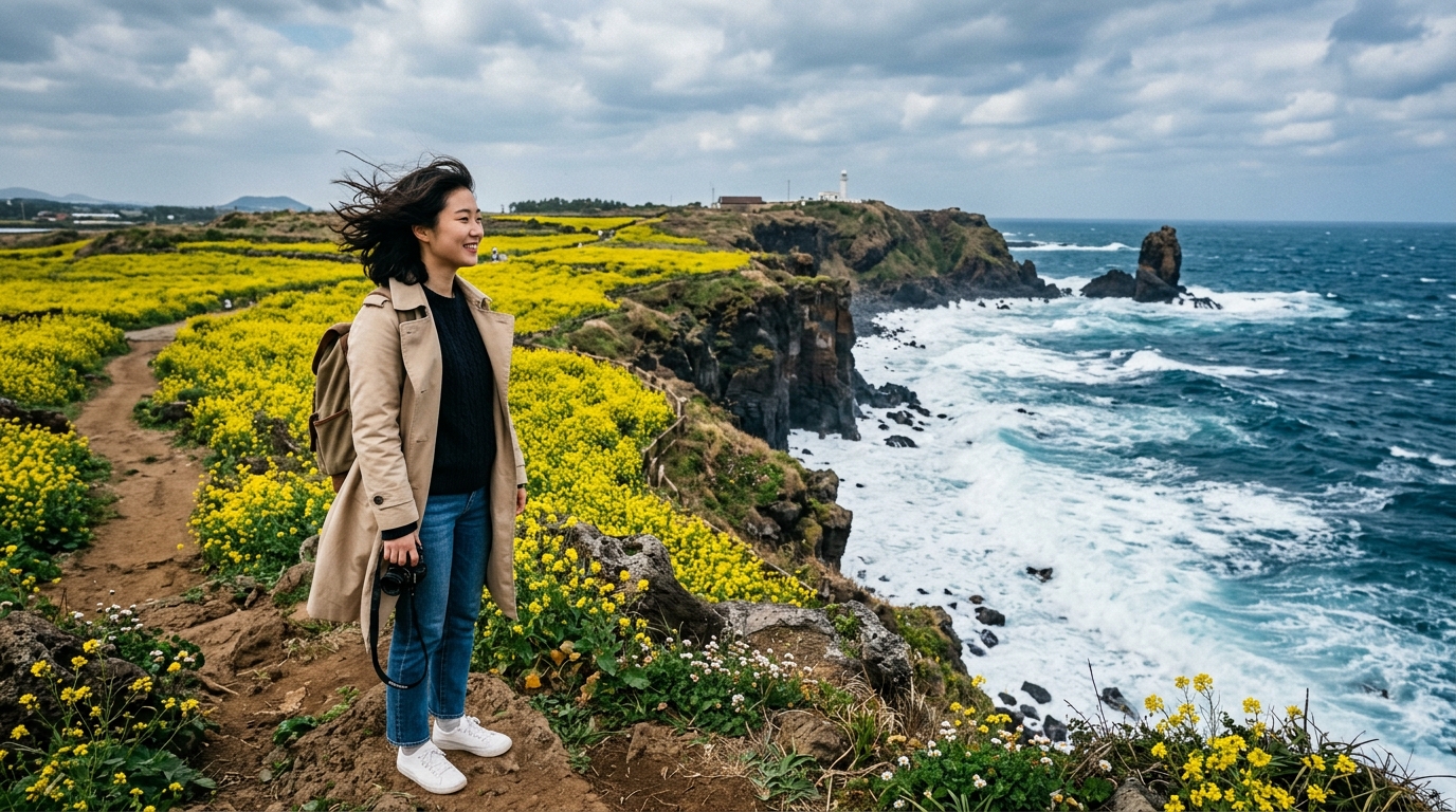 2~3월 제주는 낮에는 따뜻해도 아침저녁 바람이 차갑습니다. 얇은 겉옷이나 바람막이를 반드시 챙기세요.