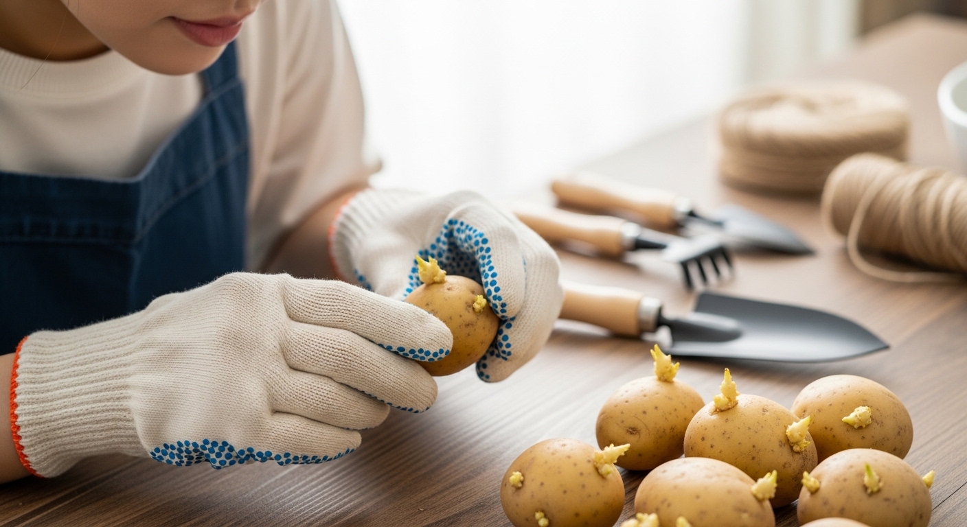 - 씨감자 선택 — 30~250g 범위의 건강한 감자를 선택합니다. 30g 이하나 250g 이상은 제거합니다. 텃밭 소량 재배 시 시중에서 판매하는 싹튼 씨감자를 구매하는 것이 편리합니다.