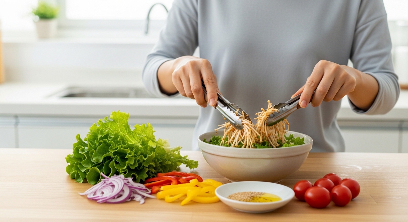 팽이버섯은 100g당 약 22kcal로 저칼로리 식품입니다. 식이섬유·비타민D·비타민B가 풍부하고 면역력 향상에도 도움이 됩니다. 다이어트 중에도 부담 없이 즐길 수 있는 건강 반찬입니다.
