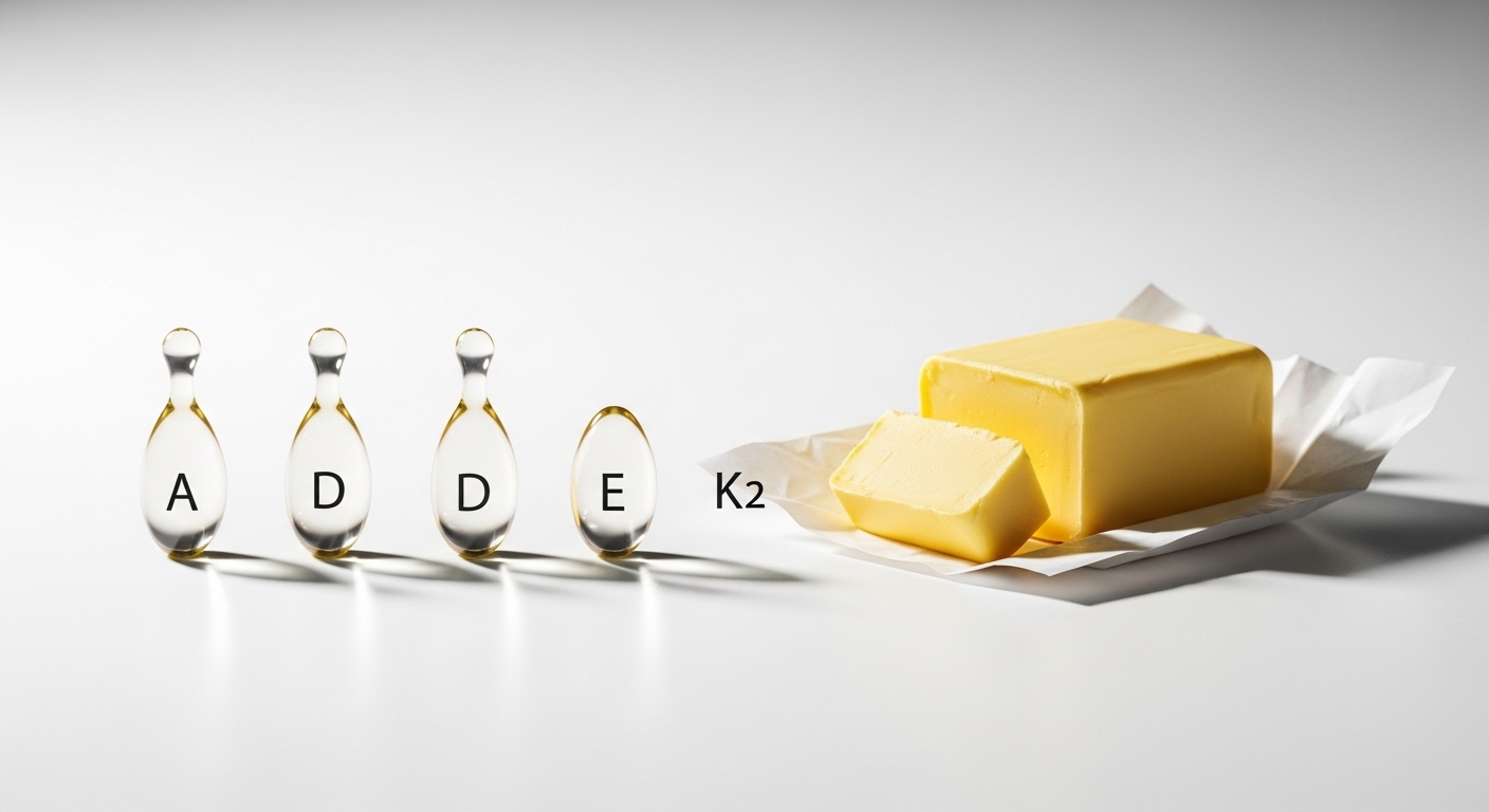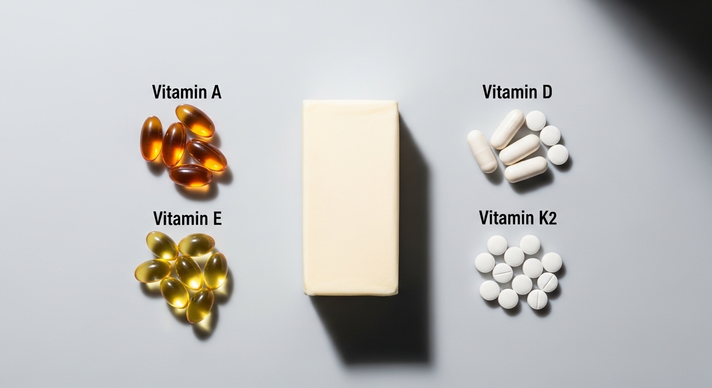 버터에는 비타민 A, D, E, K2가 풍부하게 들어있습니다. 특히 비타민 K2는 칼슘이 뼈로 잘 흡수되도록 도와 골다공증 예방과 치아 건강에 중요한 역할을 합니다. 이러한 지용성 비타민들은 지방과 함께 섭취할 때 흡수율이 높아지므로, 버터 자체가 이 영양소들을 전달하는 완벽한 매개체가 됩니다. 눈 건강과 피부 재생에도 긍정적인 영향을 미칩니다.
