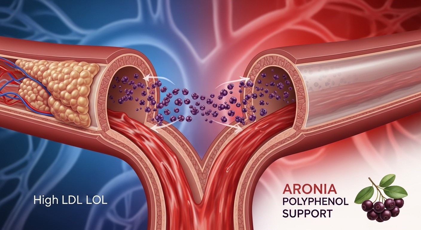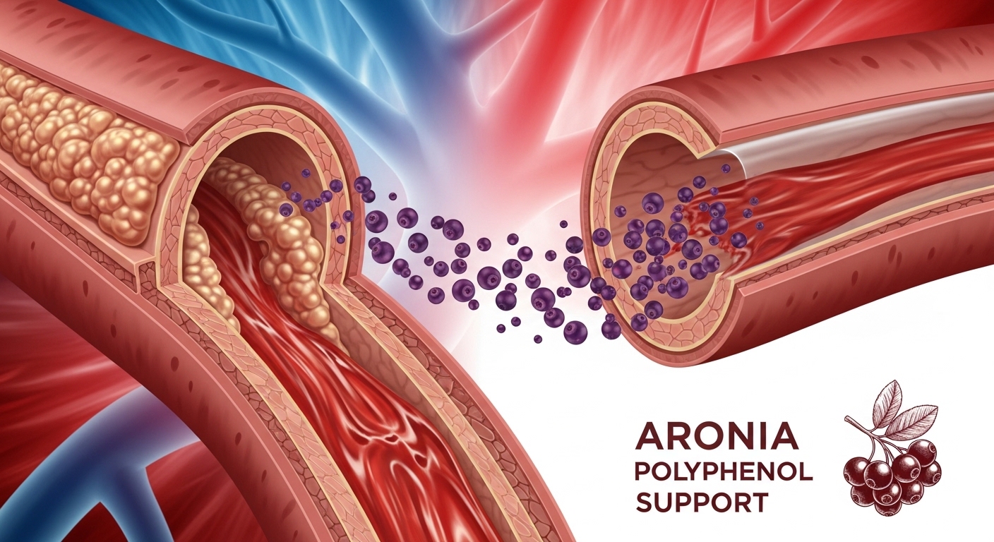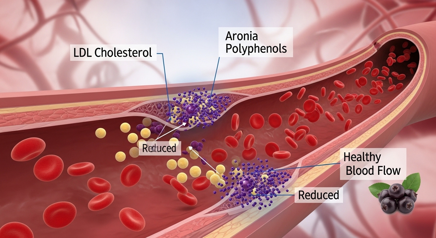 아로니아는 혈액순환을 돕고 혈관 벽을 튼튼하게 하여 심혈관 질환 예방에 기여합니다.