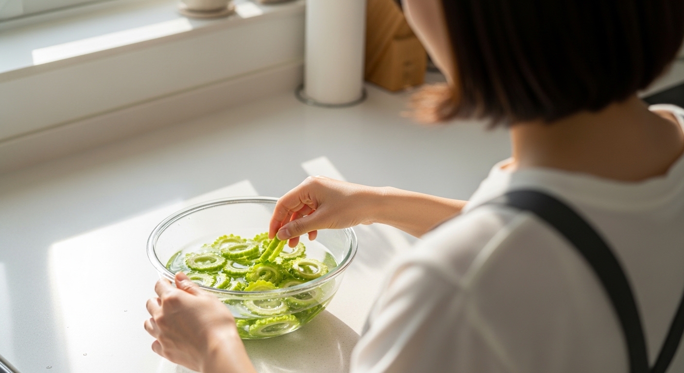 여주를 얇게 썰어 소금물에 20분 정도 담가두거나, 씨를 완전히 제거한 뒤 조리하면 쓴맛을 효과적으로 완화할 수 있습니다.