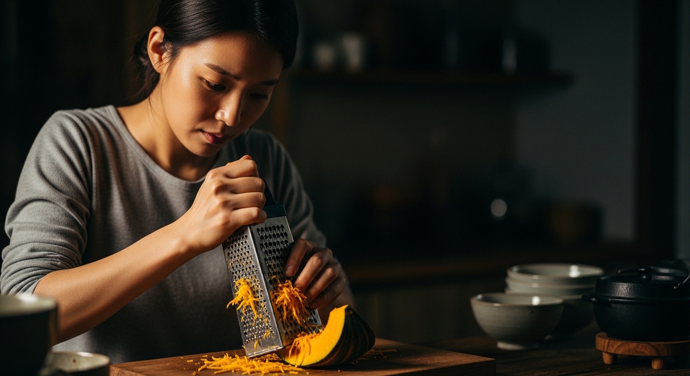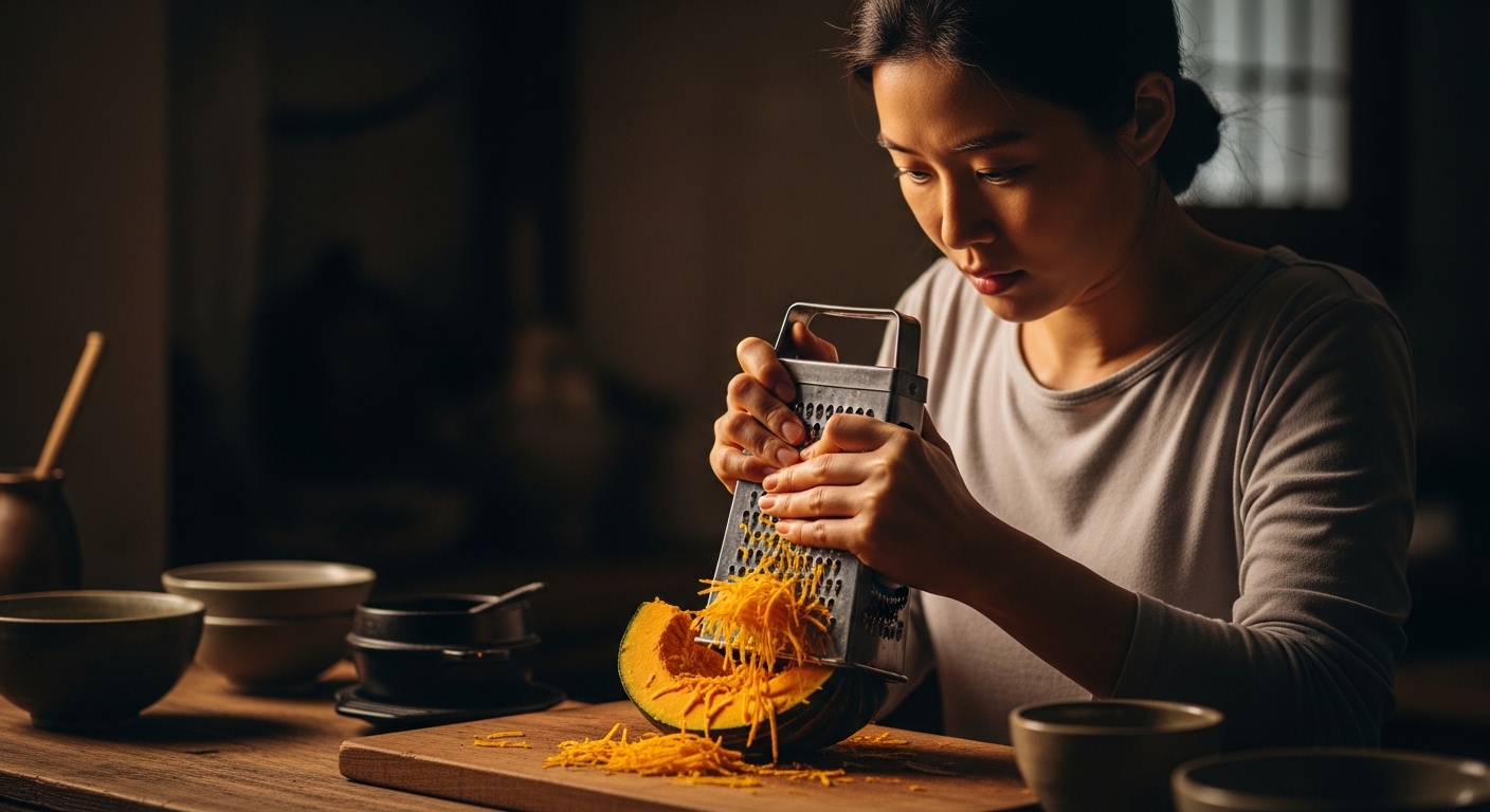 1. 호박 손질: 늙은 호박은 껍질을 벗기고 씨를 긁어낸 뒤, 최대한 얇게 채 썰거나 강판에 갈아 준비합니다.