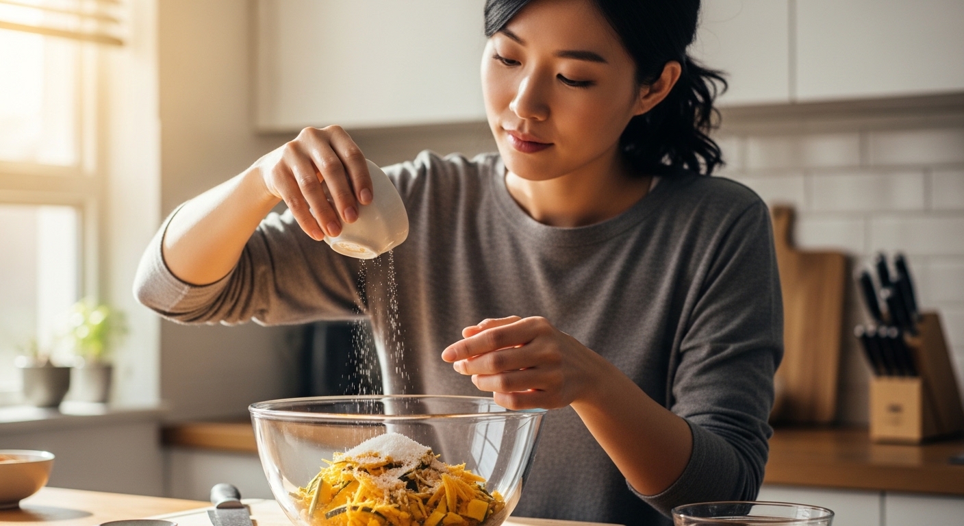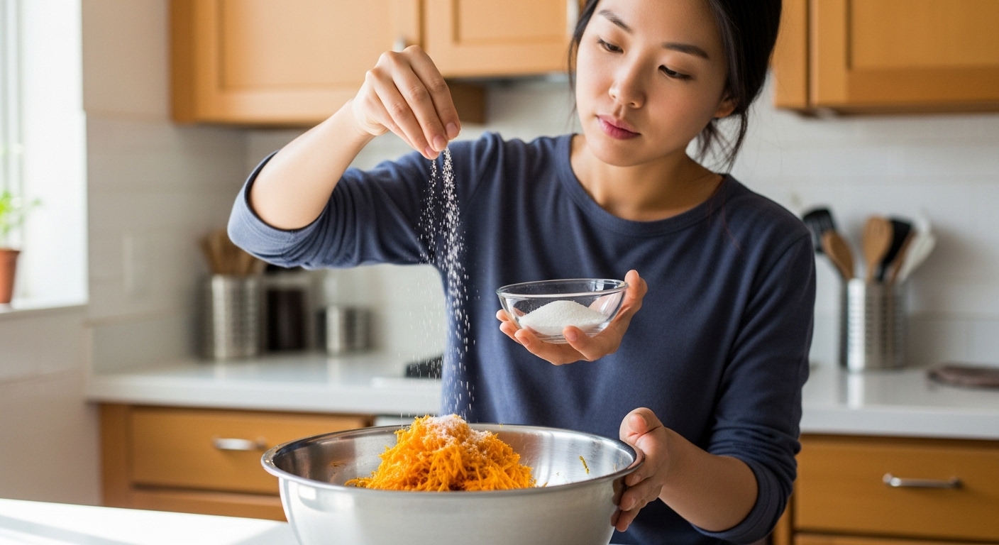 2. 수분 빼기: 채 썬 호박에 분량의 소금과 설탕을 뿌려 10분 정도 절여두면 호박 자체에서 달콤한 물이 나옵니다.