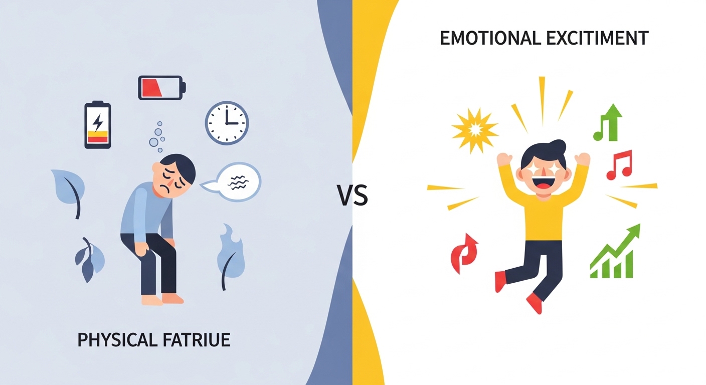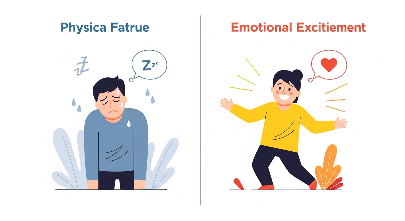 | 뉘앙스 | 신체적 피로에 집중 | 정서적 변화와 들뜬 기분 포함 |