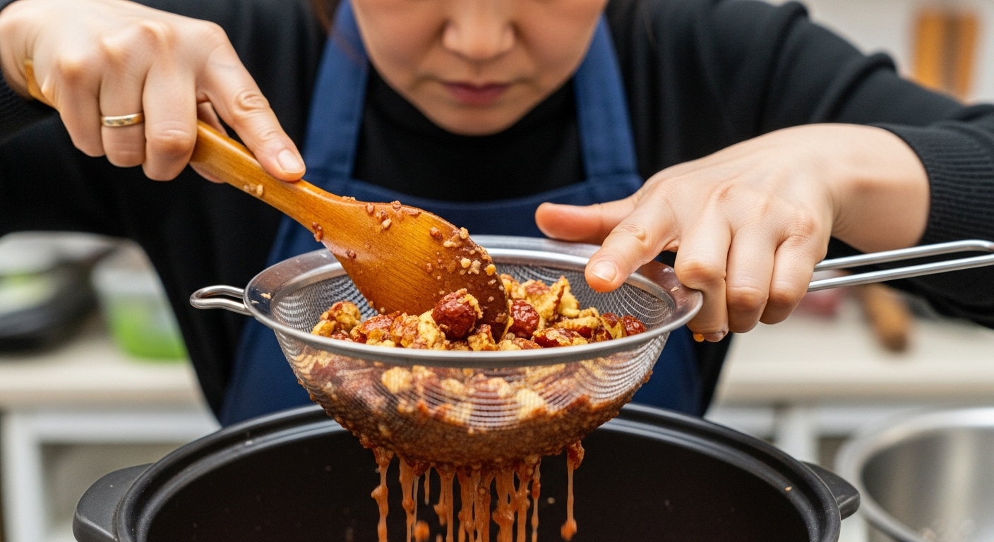 대추가 흐물흐물해졌을 때 대추를 건져내어 채반에 올립니다. 주걱으로 대추 살을 꾹꾹 눌러 껍질과 씨만 남기고 부드러운 속살(앙금)을 다시 달인 물에 내려보냅니다. 이 과정을 거쳐야 시중 판매용과는 비교할 수 없는 걸쭉함이 생깁니다.