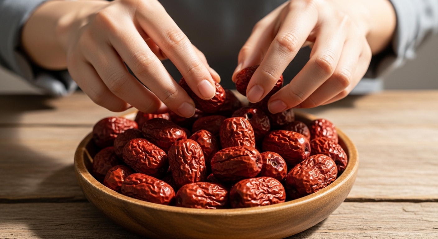 대추차의 맛은 8할이 원재료에서 결정됩니다. 주름이 고르고 붉은빛이 선명한 것이 좋으며, 만졌을 때 너무 딱딱하지 않고 탄력이 느껴지는 것이 속이 꽉 찬 대추입니다. 특히 '경산 대추'나 '보은 대추'처럼 유명 산지의 것을 사용하면 당도가 훨씬 높습니다.
