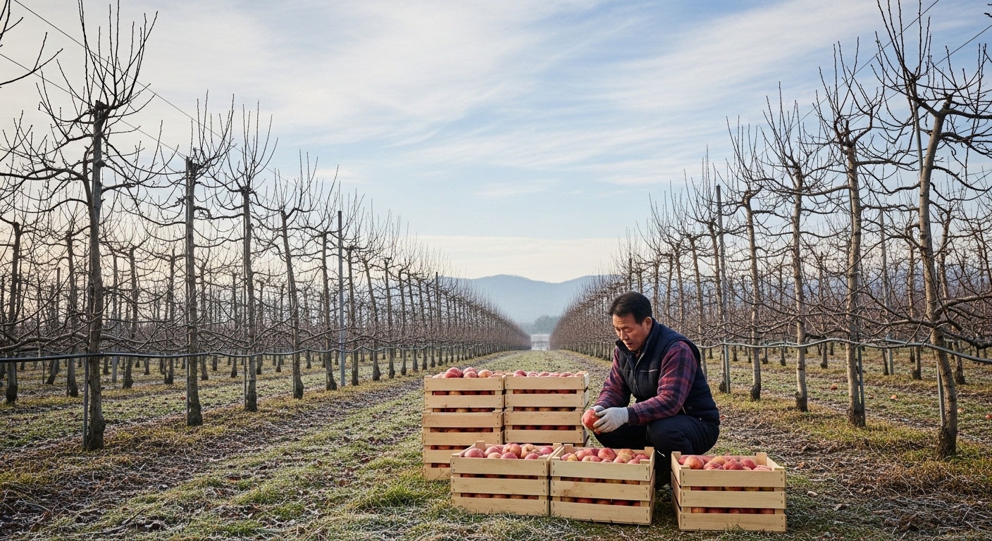 - 부사(후지): 11월에 수확하여 이듬해 여름까지 저장 판매되는 대표 품종입니다. 당도가 높고 저장성이 좋아 현재 가장 안정적인 가격대를 형성합니다.